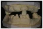 心疾患と高血圧症で加療中の79歳のおばあちゃん(Dさん)が、某医院からの診療情報提供書を持って来院されました。「歯がグラグラして痛くて噛めないんです」ということです。提供書には、「ワーファリン内服下での抜歯をお願いします」との依頼でした。早速口の中を見せてもらいました。奥歯には歯が無く、噛めるところは前歯だけでした。しかし、その頼みの綱の前歯がグラグラになり、噛めなくなってしまったのです。我慢に我慢を重ねてきたことが伺えました。とりあえずグラグラの2本の前歯を抜歯して、次の日、消毒と一緒に「このままでは全然噛めないので、仮歯でも作りましょうね。」と言って、上下の歯型を採りました。その時の石膏模型がこれです。
